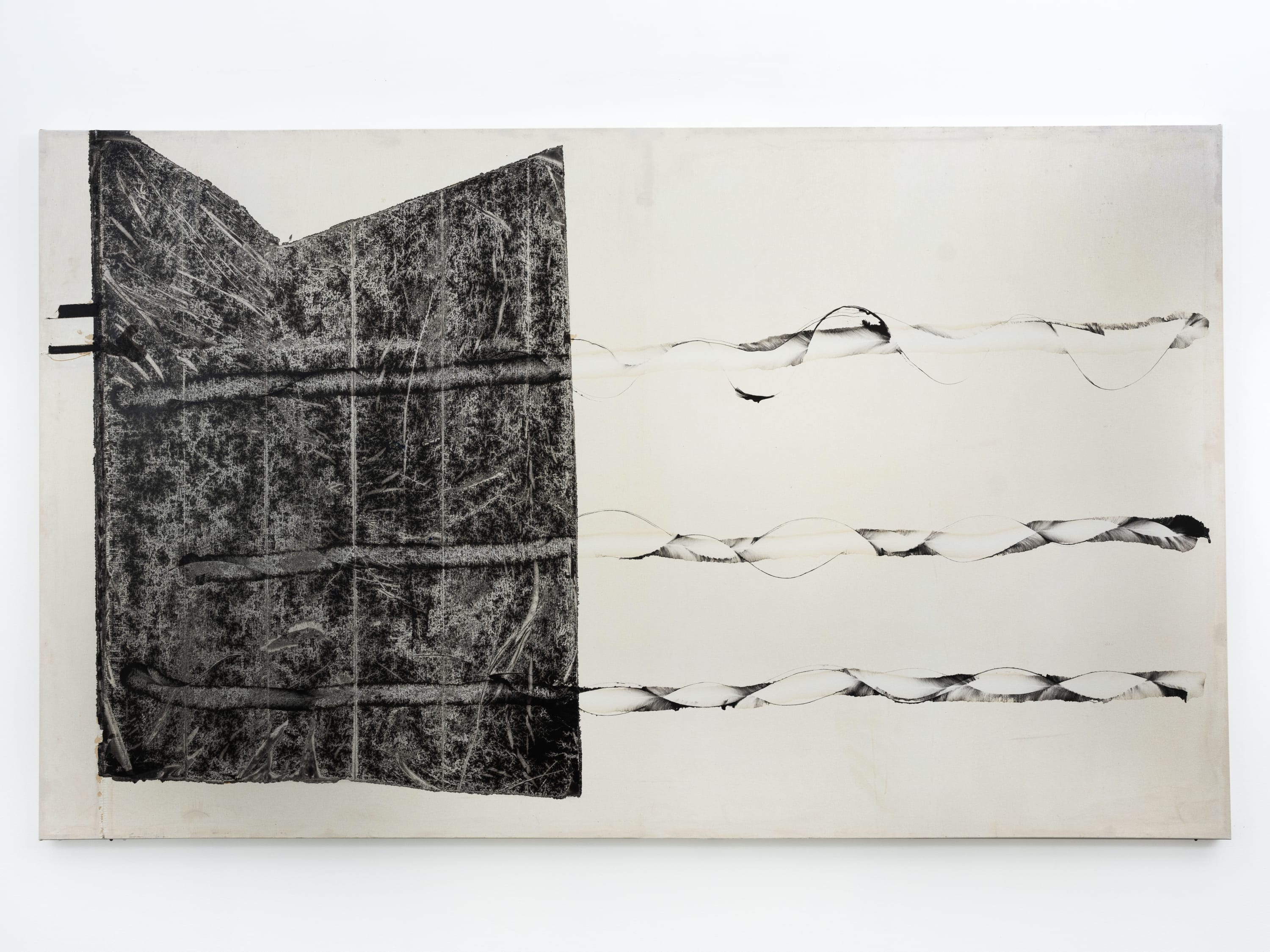The compressor steers air into cylindrical volumes, diffusing acrylic and oil paints in methodical structures. In Untitled (Black and White Compressor Composition), Creecy has utilized pressure from the air compressor to spread swaths of black and white pigment in horizontal striations, which embed onto the surface and within the body of the canvas. Similarly, Untitled (Black and Purple Composition) uses the same technology to create a rhythmic cadence of purple and black. The work pulses, its forms intertwining and dancing in an elliptical motion – like a cocoonic DNA strand.